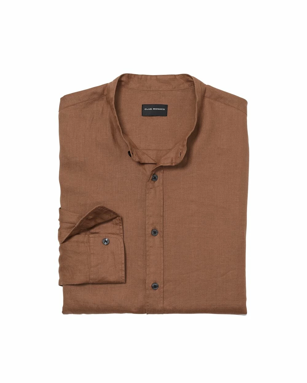 The case for the band collar. Our signature slim shirt updated with a sleek band collar in breathable, lightweight linen. For the warmer months.