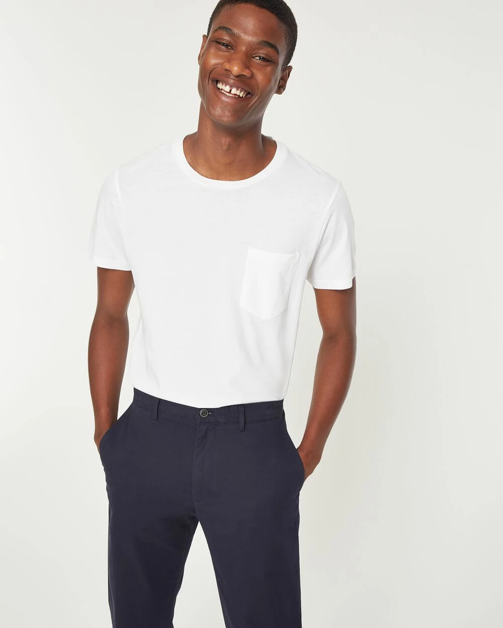 - Set-on waistband; belt loops; flat front; coin pocket; two side pockets; two back pockets