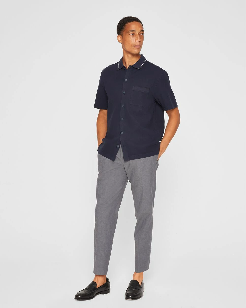 - Rib-knit spread collar with contrast tipping; chest pocket; short sleeves; straight hem