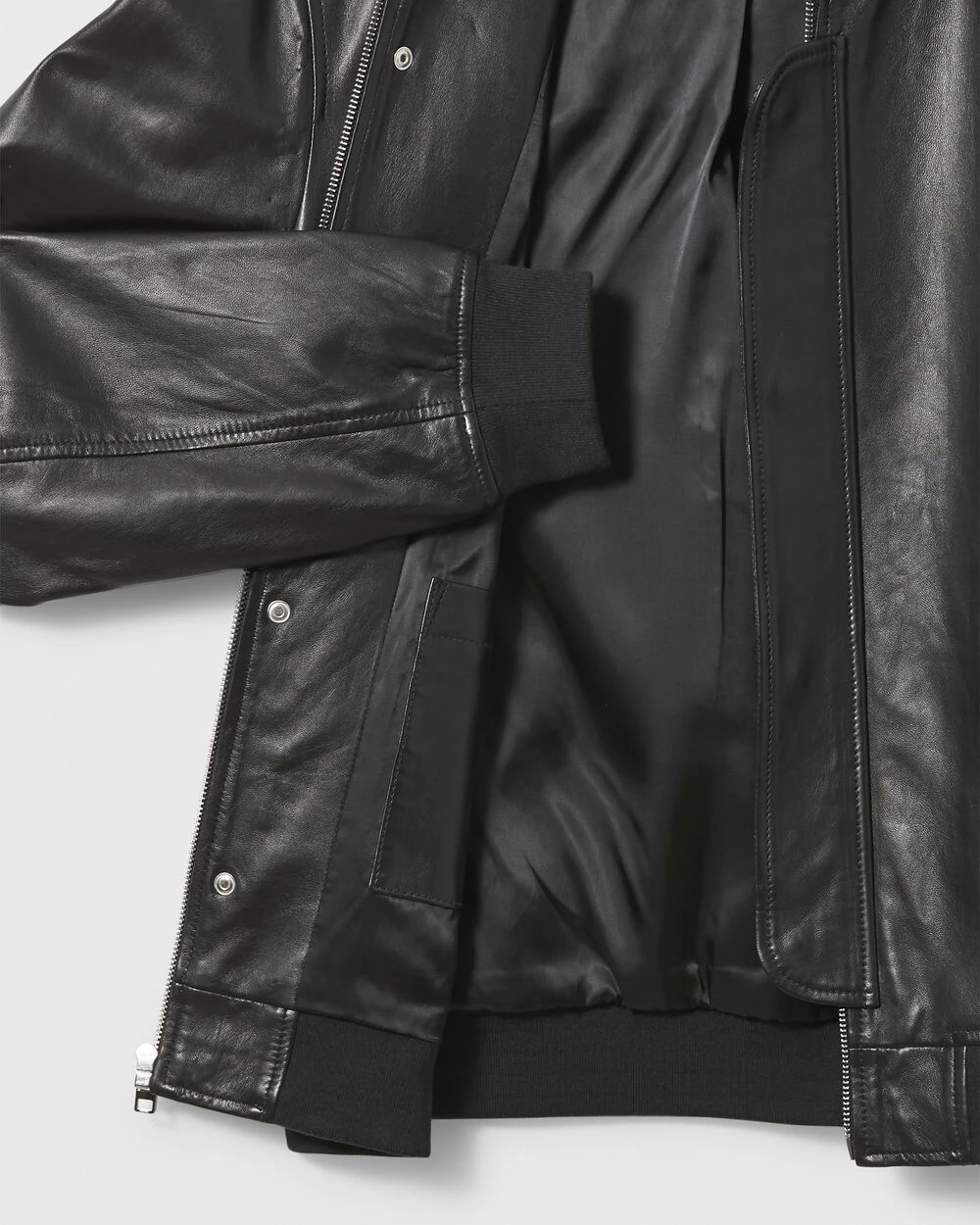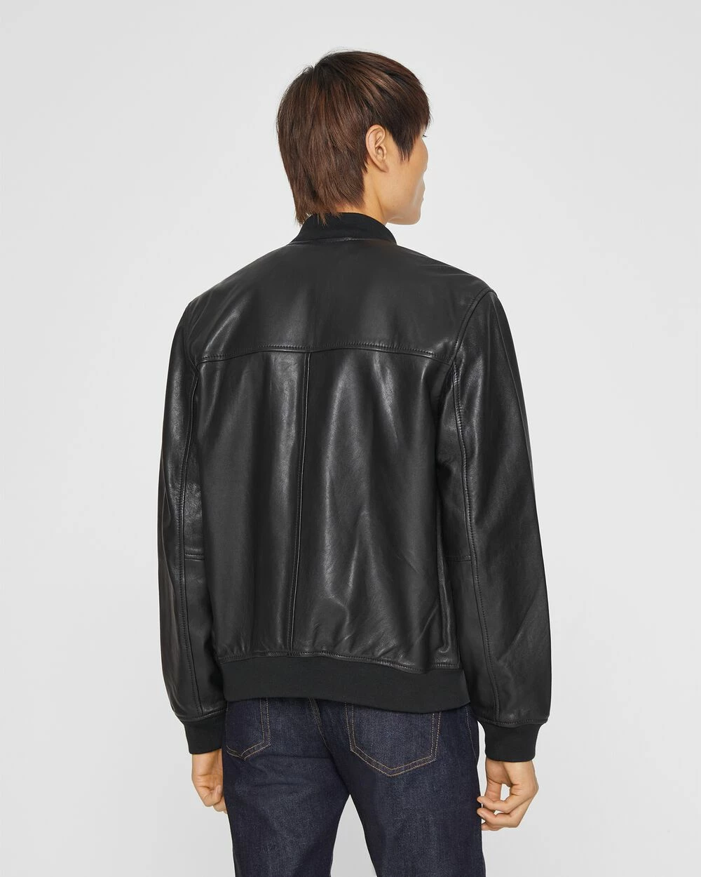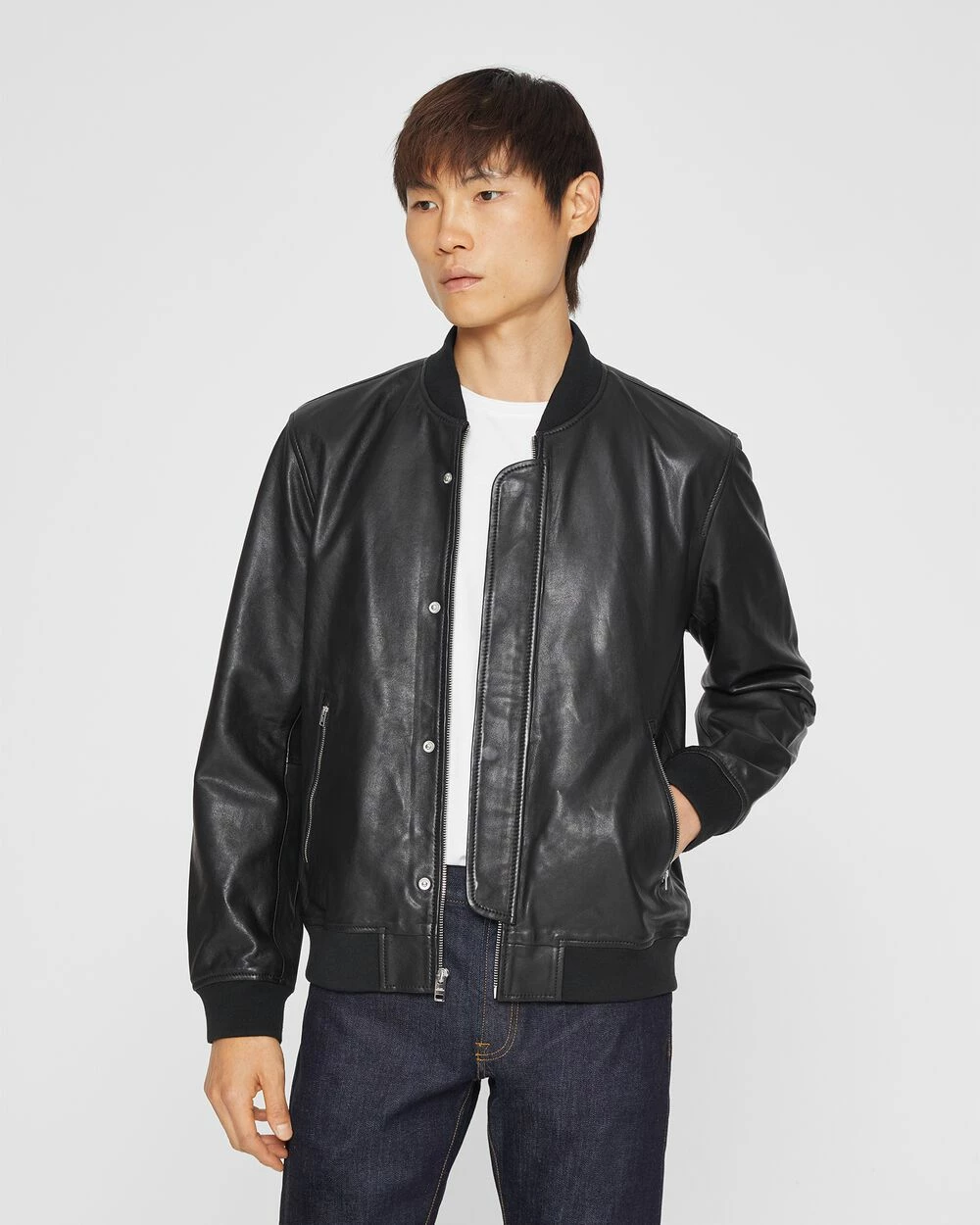 For now and always. Cut lean but not too snug, the timeless bomber jacket is updated in a rugged black leather for a subtle vintage nod. Finished with zippered pockets for stashing essentials.