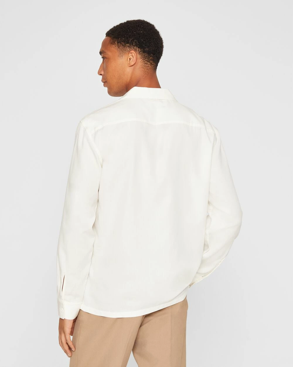 - Camp collar; long sleeves with single-button barrel cuffs; back shoulder yoke; straight hem with side-seam slits