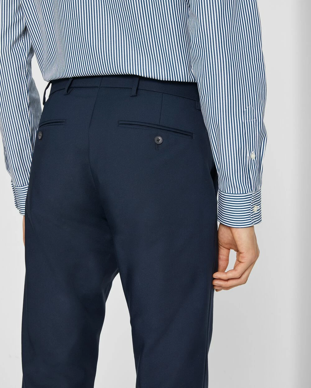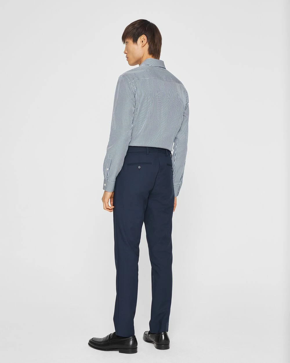 The dress trouser, updated. Cut slim in a cool cotton fabric with comfortable stretch. A sleek essential to wear at work and after hours too.