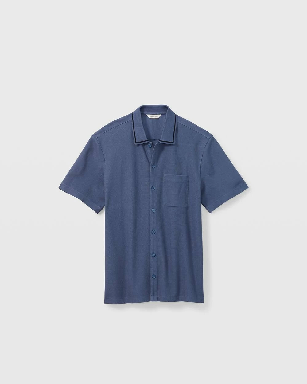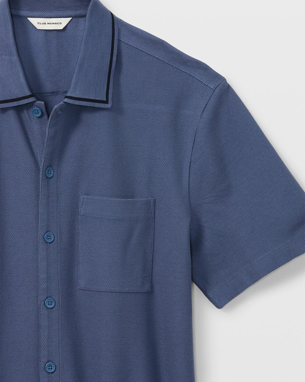 - Rib-knit spread collar with contrast tipping; chest pocket; short sleeves; back shoulder yoke; straight hem with side-seam slits