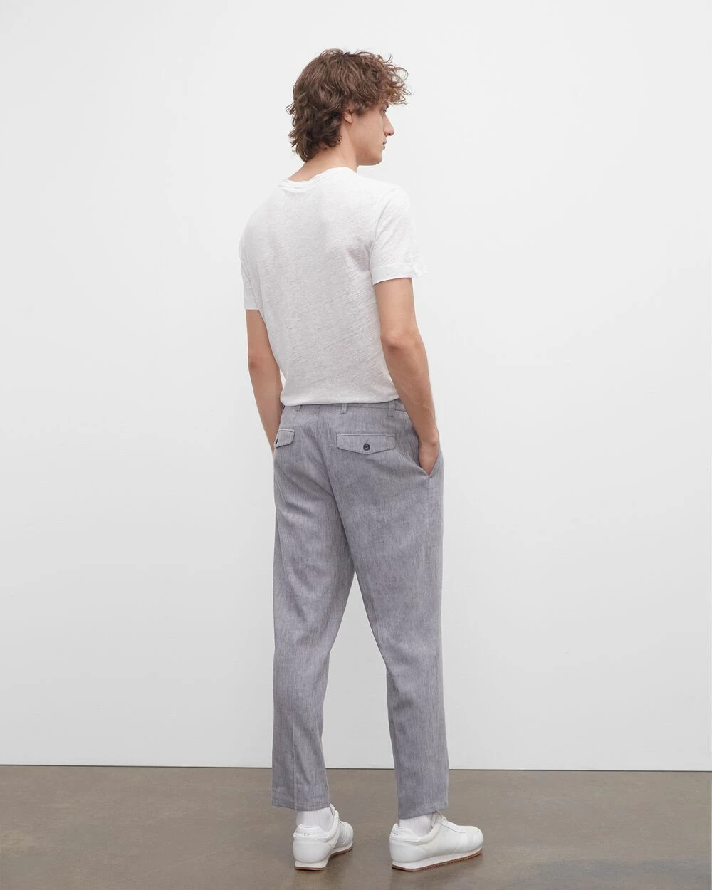 Semi-formal. A pleated front and classic five-pocket styling give a traditional feel to these trousers while a tapered silhouette and stretch linen-blend fabric keep it cool and comfortable.