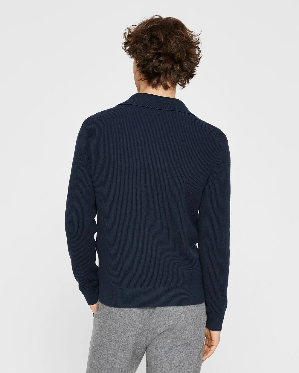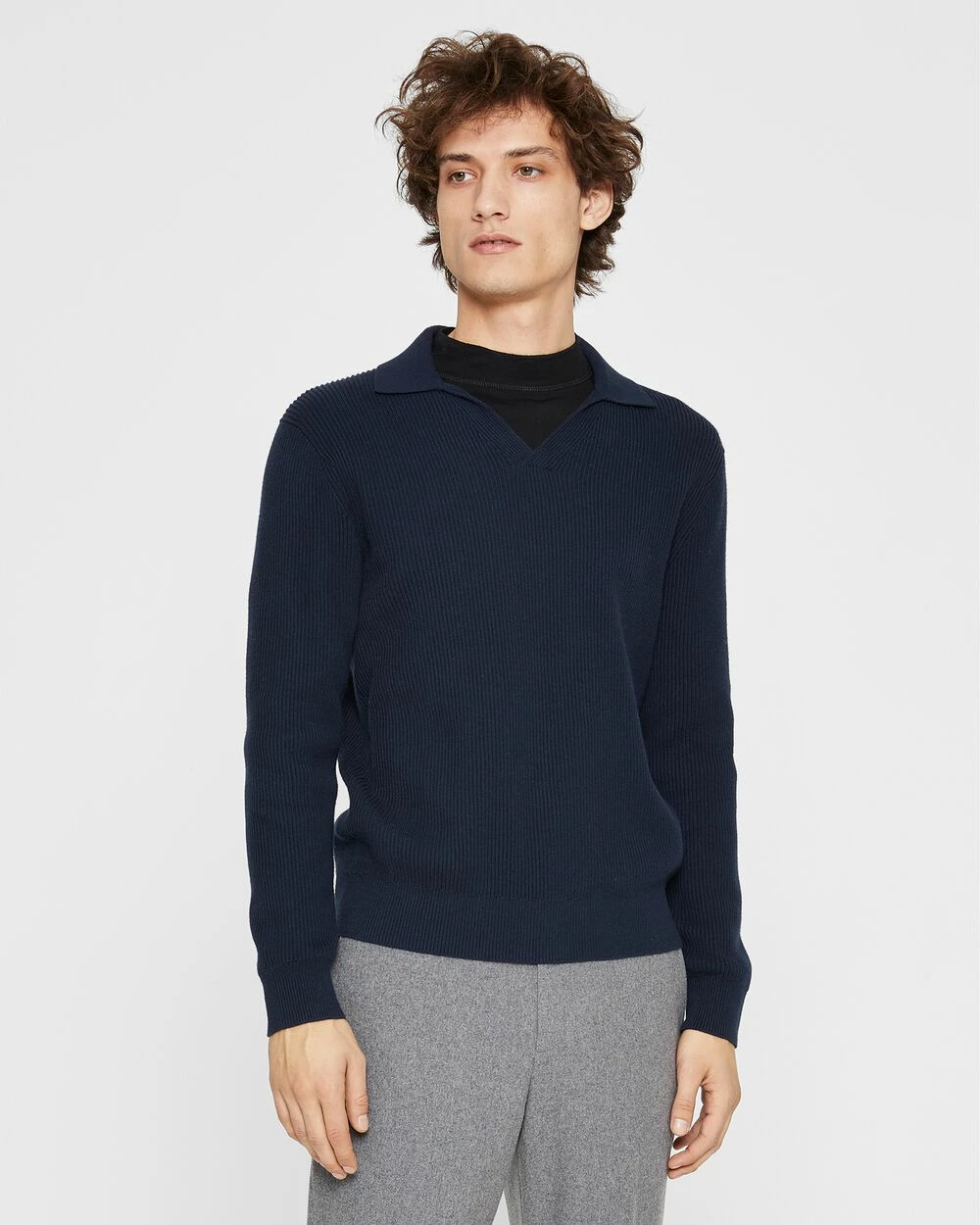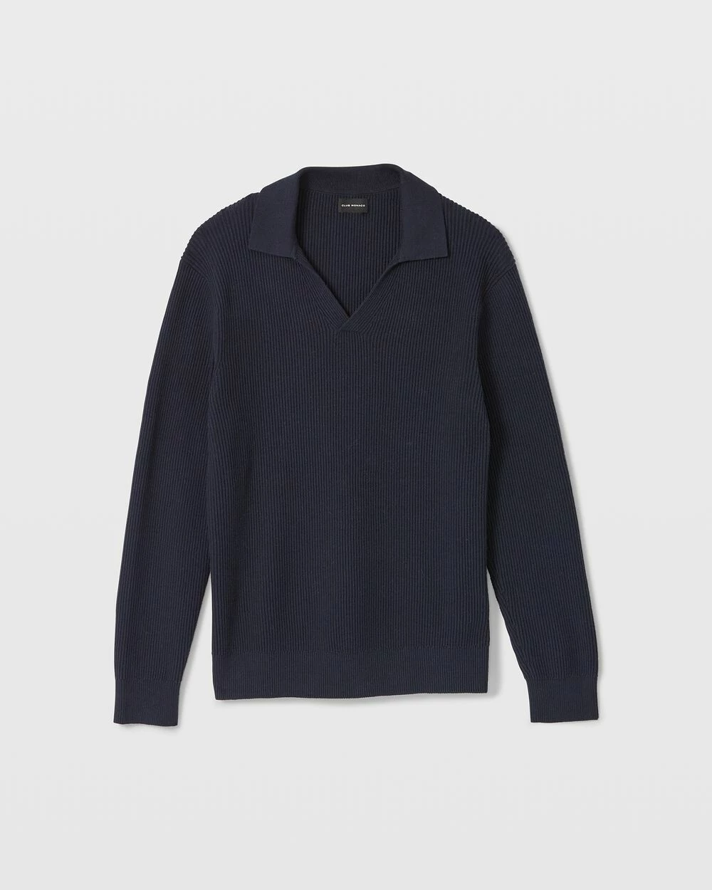 An easy-fitting sweater with a clean-lined Johnny collar and vertical ribbing offers polished versatility. Wear under blazers for a fresh take on weekday dressing.