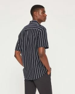 - Rib-knit spread collar, cuffs, and hem; short sleeves; side stripe detail