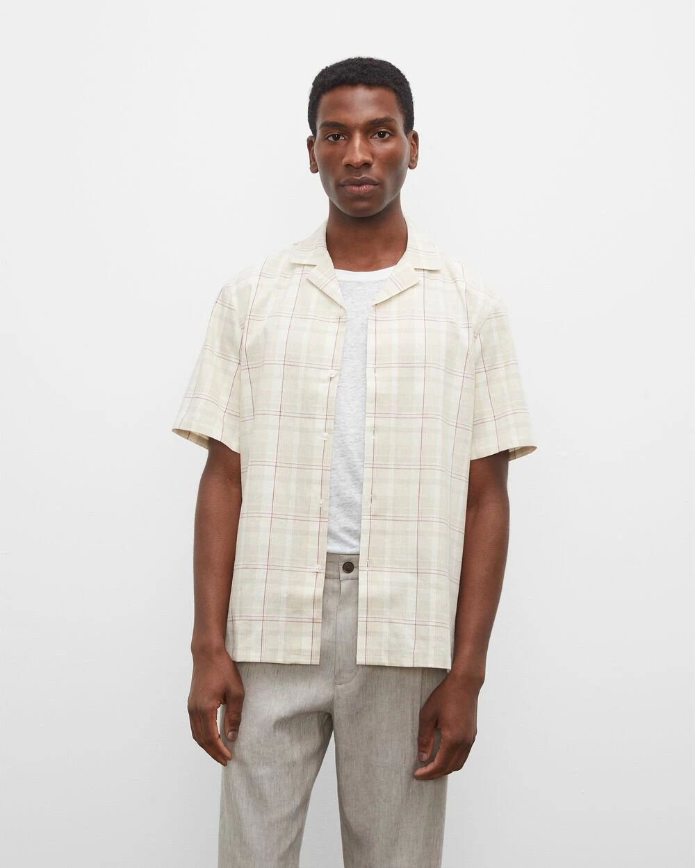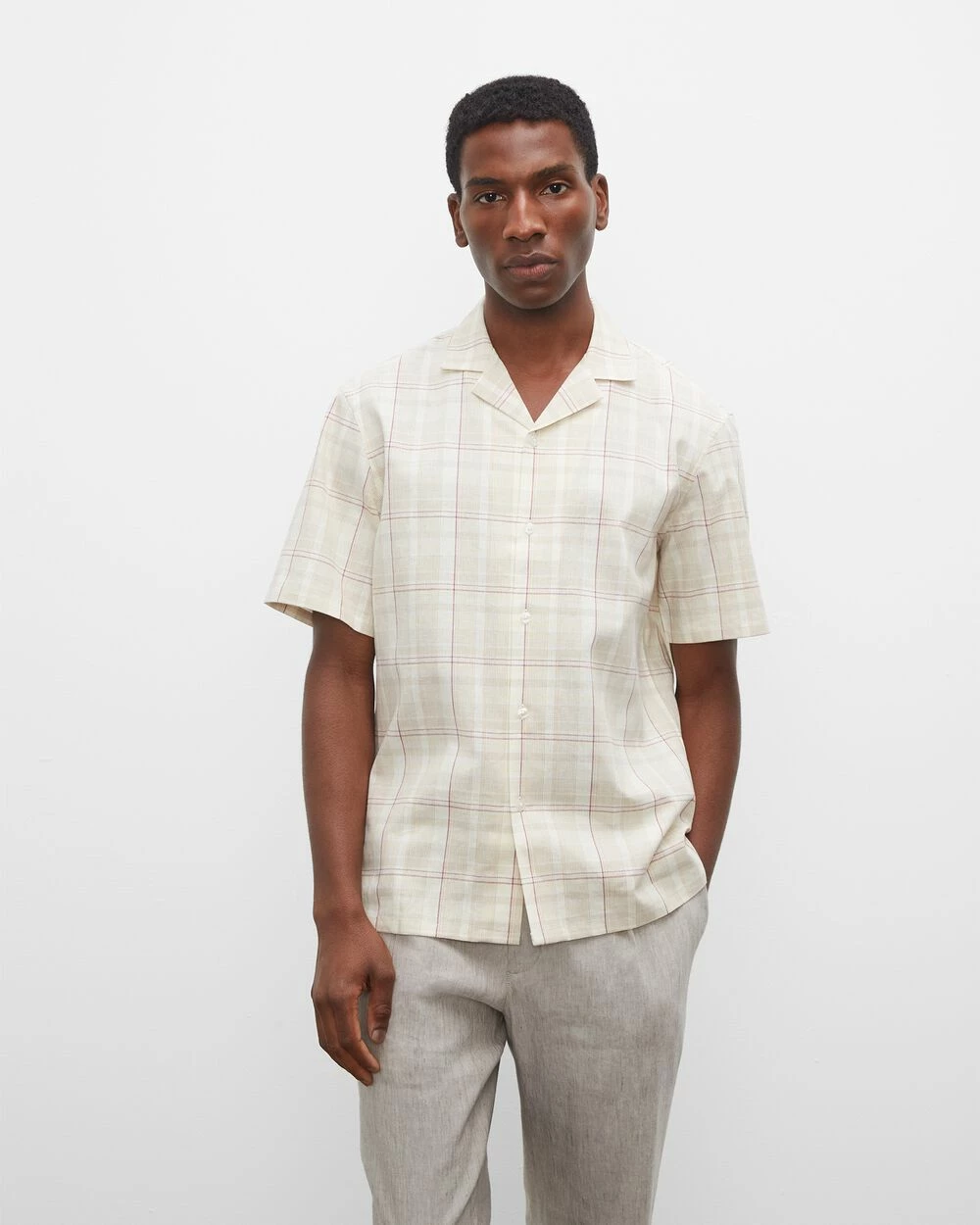 Keep it light. A slim-fit button-down shirt made for warmer days, with short sleeves and a breathable linen blend with just the right amount of stretch. Styled with a camp collar for a casual finish.