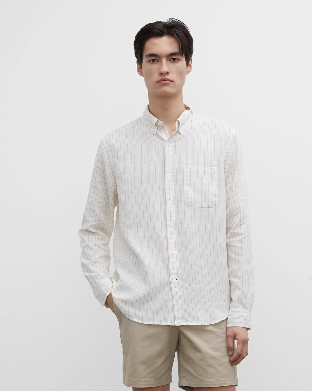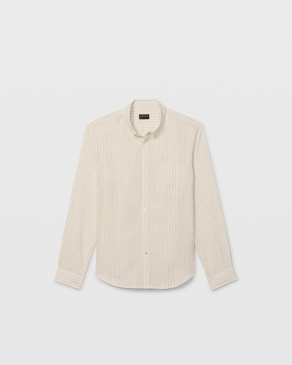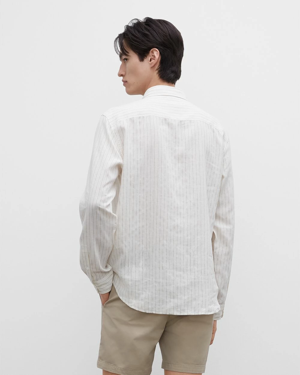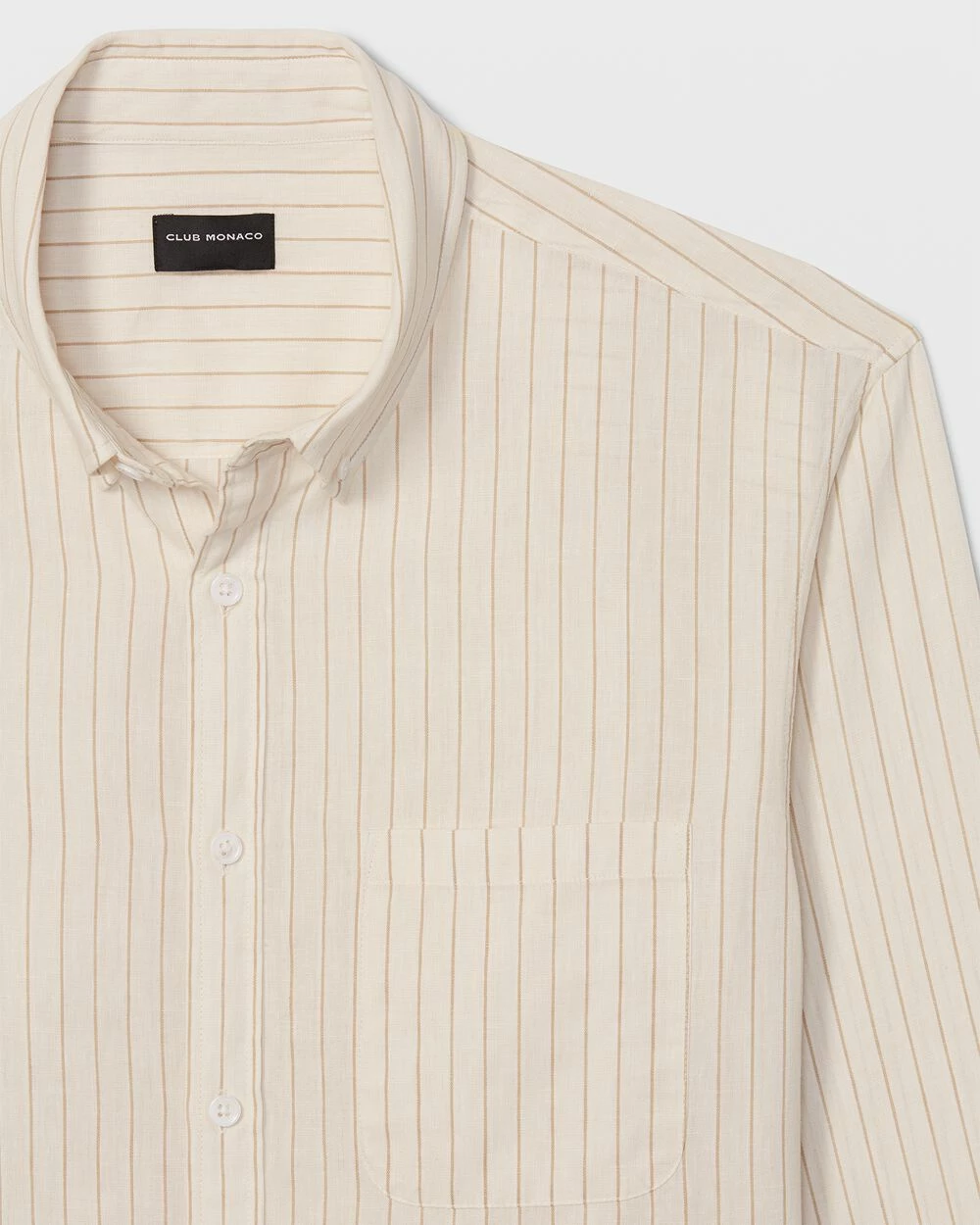 Linen season. Our signature slim shirt updated in a soft, lightweight striped linen for the warmer months. For virtual brunches, beach days, and everything in between.