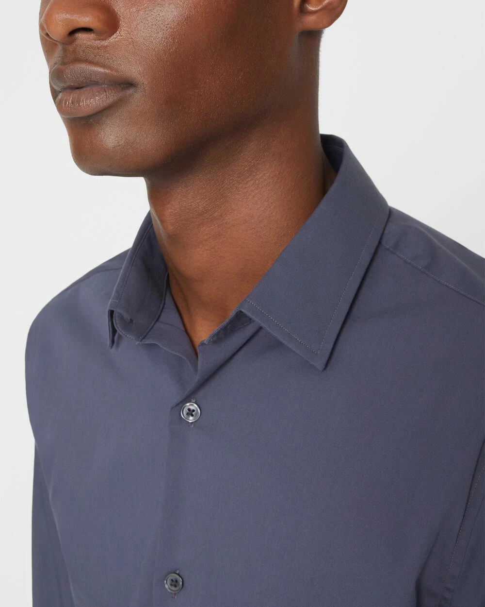 - Point collar; long sleeves; two-button barrel cuffs; shirttail hem with reinforced side seams