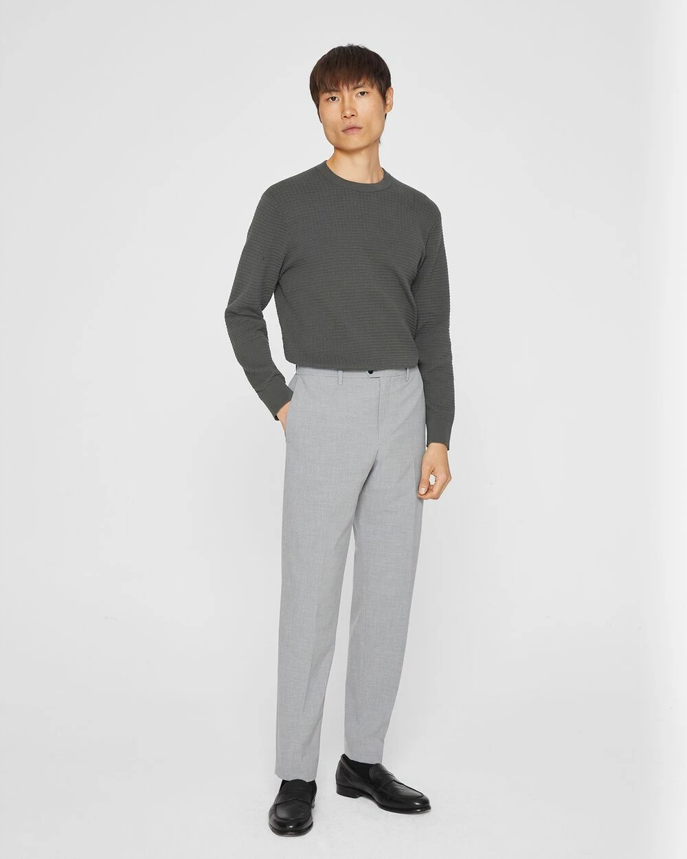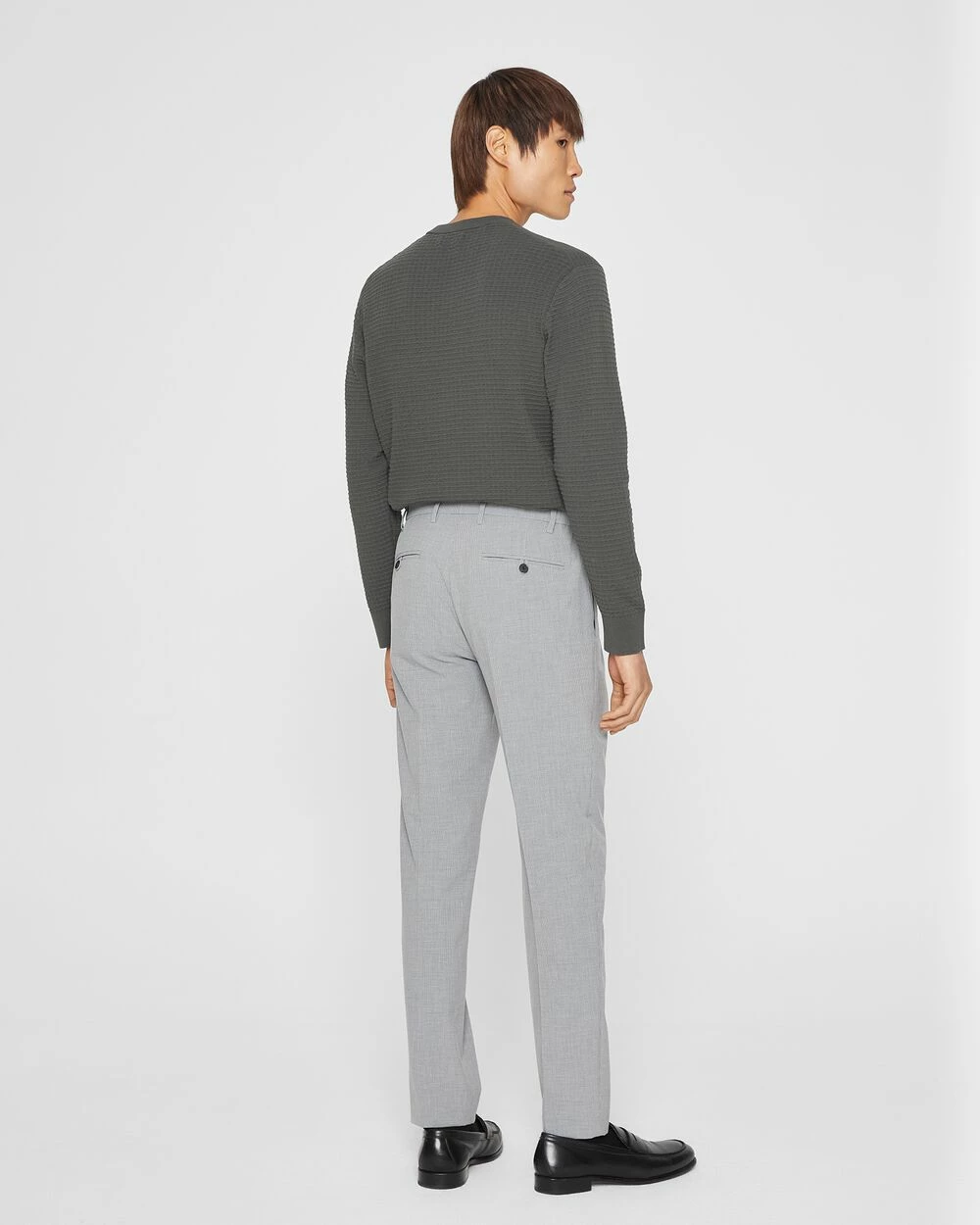- Set-on waistband; belt loops; two side pockets; one coin pocket; two back pockets; creased legs
