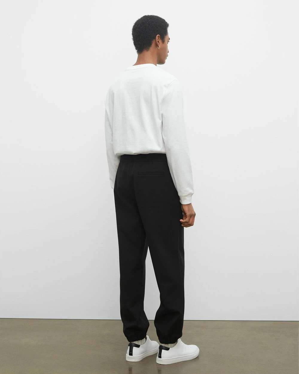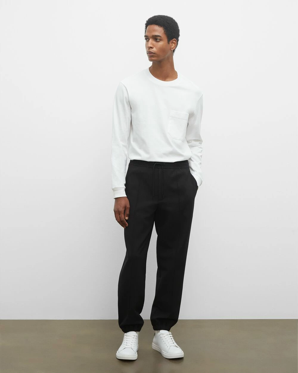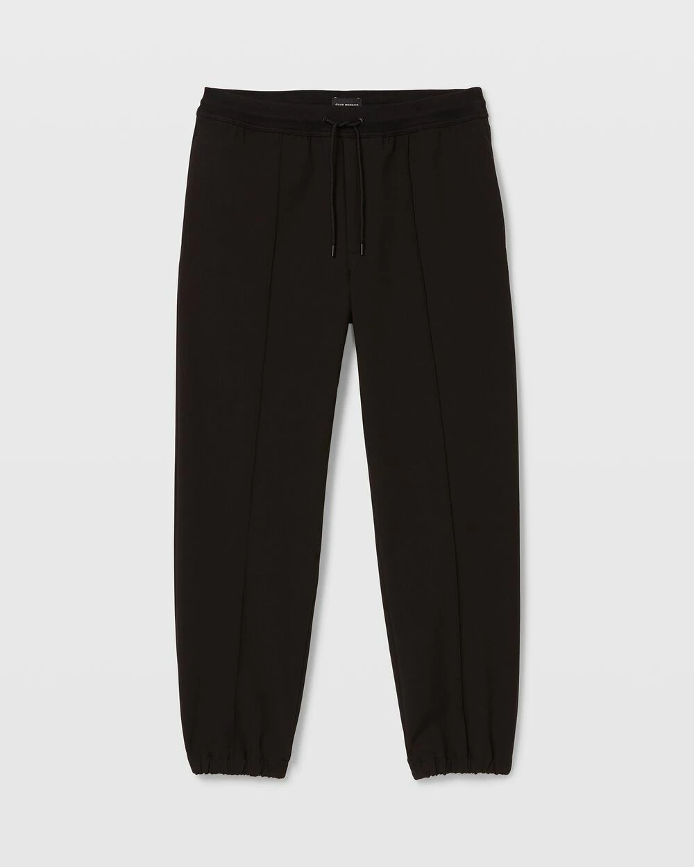 - Cased elastic drawstring waistband; two side pockets; front center seam; one back pocket; elasticized cuffs